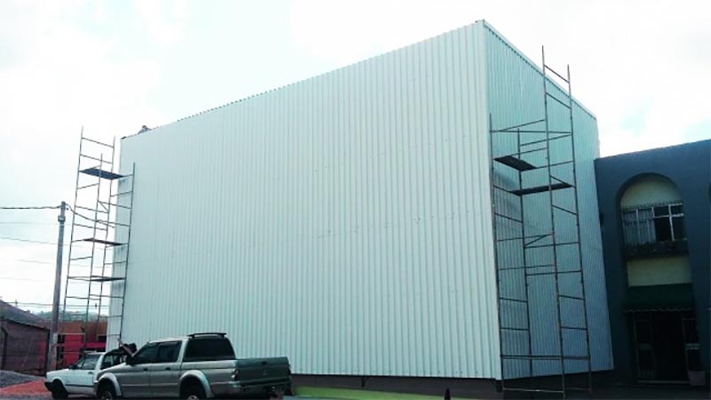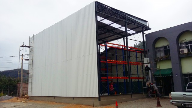Galpão de armazenamento construído em perfis metálicos com cobertura e tapamentos em telhas galvalume.